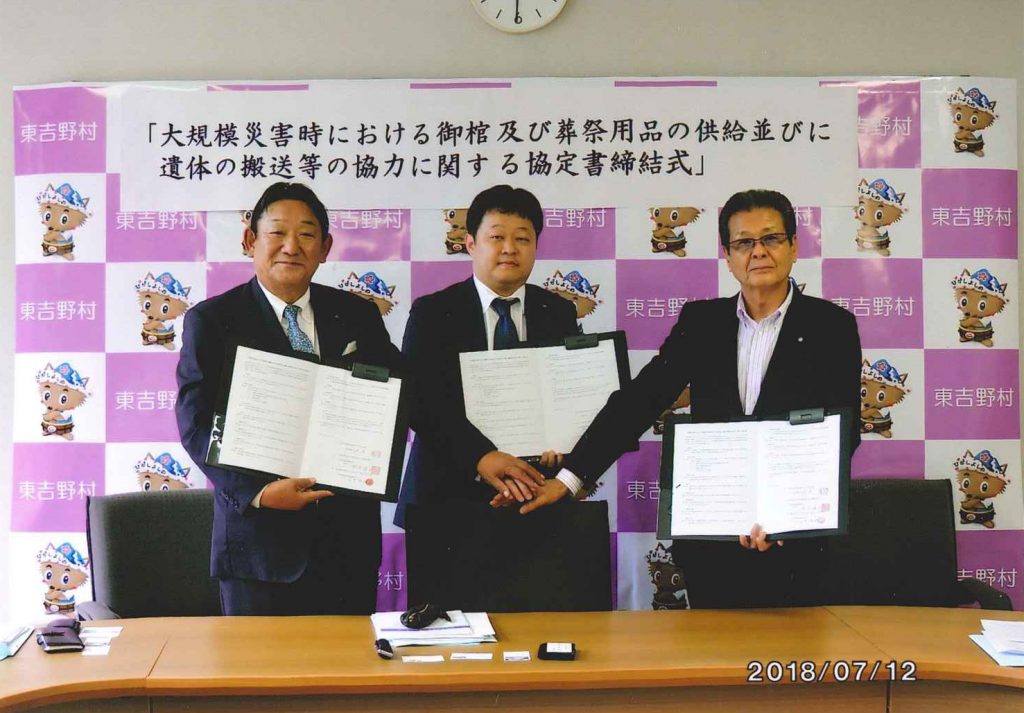 7月12日に奈良県東吉野村へ「大規模災害時における葬祭用品供給についての災害協定に行って参りました。万一同地域に台風、豪雨などの自然災害等が発生した場合、奈良県葬祭業協同組合と連携し、東吉野村並びに住民の皆様に最大限協力するというものです。東吉野村は桜でも有名な緑多く自然豊かなすばらしい地域です。