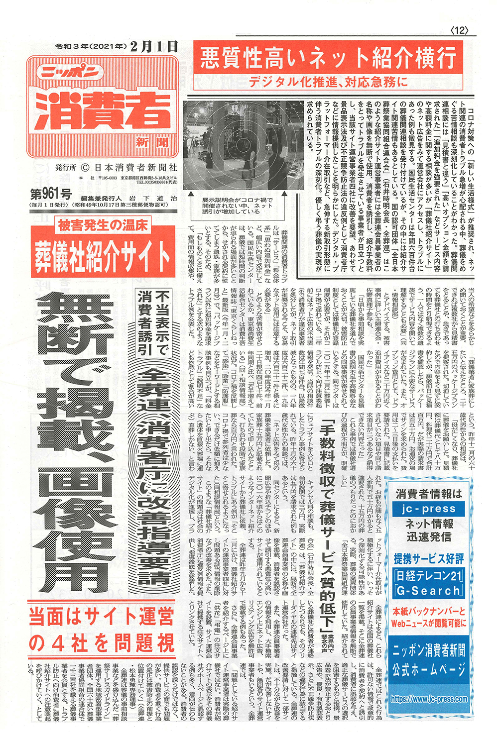 【令和3年2月1日 発行】ニッポン消費者新聞に葬儀社紹介サイトによる被害発生についての記事が掲載