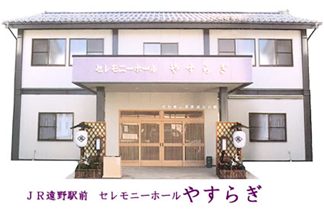 セレモニーホールやすらぎは、地域貢献を目的とした通夜、葬儀施設として、平成16年JR遠野駅前にオープンいたしました。ご遺族の立場になり、低価格の家族葬から故人の意思を尊重したオリジナル葬儀まで幅広くご利用いただいております。